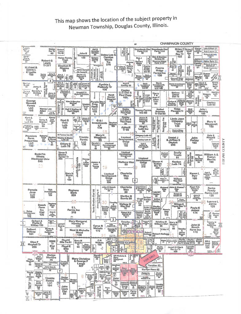 The farm is located in Sections 4 and 5, Township 16 North, Range 14 West, Newman Township, Douglas County, IL