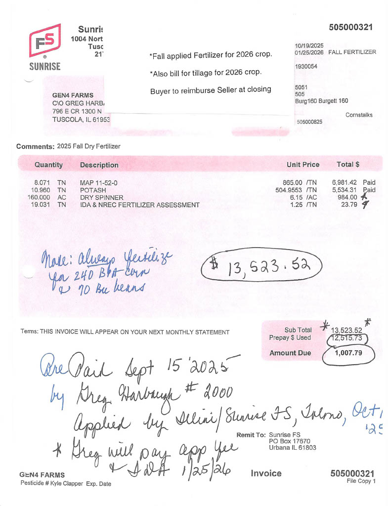 The farm is operated by Harbaugh Farms for the 2025 crop year but will be sold lease-free for the 2026 crop year.  Possessions will be per terms of Purchase Agreement.  Any Government payments for 2025 year is property of Seller.  Any Government payments that might be paid on 2025 crops are retained by Seller, whether disbursed in 2025 or a later date.